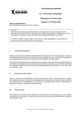 Au titre de sa mission de prévention de la tuberculose, le service des actions de prévention sanitaire confie la réalisation des clichés radiologiques, nécessaires au suivi des patients concernés, à des structures de radiologie publiques ou privées. Le présent rapport a pour objet de soumettre à votre approbation la poursuite des relations conventionnelles avec ces structures.