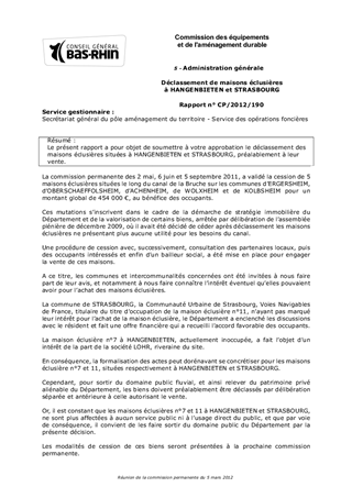 Le présent rapport a pour objet de soumettre à votre approbation le déclassement des maisons éclusières situées à HANGENBIETEN et STRASBOURG, préalablement à leur vente.