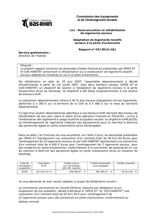 Le présent rapport concerne les demandes d'aides financières présentées par OPUS 67 et CUS HABITAT concernant la réhabilitation ou la construction de logements locatifs sociaux adaptés au handicap et /ou à la perte d'autonomie.