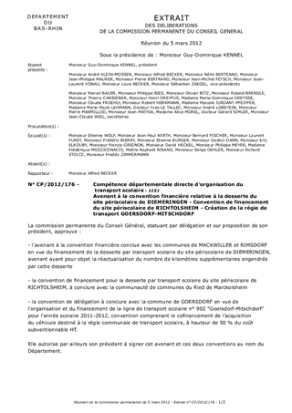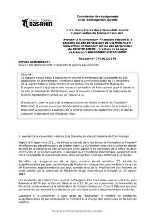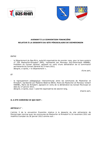 Ce rapport a pour objet d'actualiser le volume kilométrique de la desserte du site périscolaire de Diemeringen, mentionné dans la convention datée du 16 novembre 2011 signée entre le Département et les communes de Rimsdorf et Mackwiller. Il propose aussi d'approuver une nouvelle convention de financement pour la desserte du site périscolaire de Richtolsheim, avec la nouvelle communauté de communes du Ried de Marckolsheim, créée au 1er janvier 212. D'autre part, dans le cadre de la restructuration de l'école primaire de Goersdorf-Mitschdorf, le conseil municipal de Goersdorf a opté pour le transfert de la classe de Mitschdorf à Goersdorf à compter de la rentrée scolaire de septembre 2011 et décidé d'assurer le transport des élèves en régie.