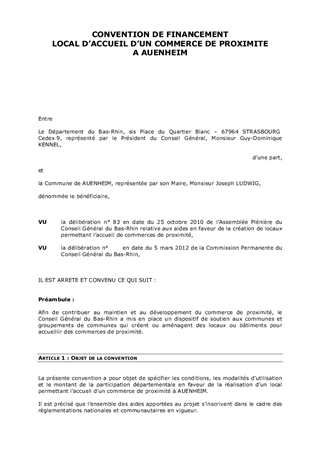Le présent raport a pour objet de soumettre à l'approbation de la Commission Permanente du Conseil Général le versement d'une subvention départementale de 231.584,10 € à la Commune d'AUENHEIM au titre de la création d'un local de commerce de proximité.