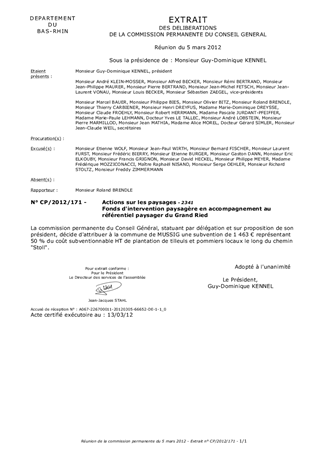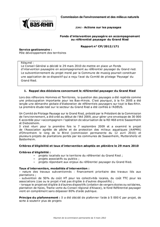 Le Conseil Général a décidé le 29 mars 2010 de mettre en place un Fonds d'intervention paysagère en accompagnement au référentiel paysager du Grand ried. Le subventionnement du projet mené par la Commune de mussig pourrait constituer une application de ce dispositif qui a reçu l'aval du Comité de pilotage 'Paysage' du Grand Ried.