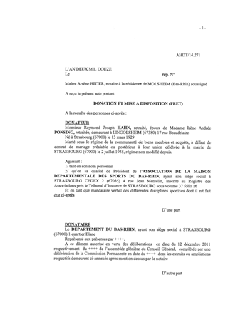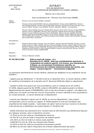 Donation de M. HAHN - Aide aux manifestations sportives, à l'acquisition de matériel sportif, à la licence, aux championnats d'Alsace, au recrutement d'animateurs sportifs, au fonctionnement de la Maison départementale des sports, aux stages ''Léonard Specht'' - Conventions d'objectifs