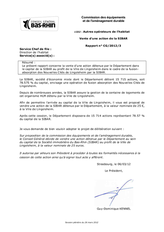 Le présent rapport concerne la vente d'une action détenue par le Département dans le capital de la SIBAR au profit de la Ville de Lingolsheim dans le cadre de la fusion-absorption des Nouvelles Cités de Lingolsheim par la SIBAR.