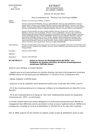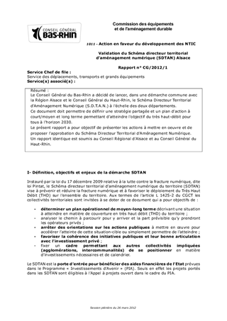 Le Conseil Général du Bas-Rhin a décidé de lancer, dans une démarche commune avec la Région Alsace et le Conseil Général du Haut-Rhin, le Schéma Directeur Territorial d'Aménagement Numérique (S.D.T.A.N.) à l'échelle des deux départements. Ce document doit permettre de définir une stratégie partagée et un plan d'action à court/moyen et long terme permettant d'atteindre l'objectif du très haut-débit pour tous à l'horizon 2030. Le présent rapport a pour objectif de présenter les actions à mettre en oeuvre et de proposer l'approbation du Schéma Directeur Territorial d'Aménagement Numérique. Un rapport identique est soumis au Conseil Régional d'Alsace et au Conseil Général du Haut-Rhin.