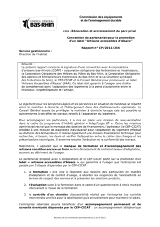 Le présent rapport concerne la signature d'une convention avec 4 corporations d'artisans bas-rhinois (COPFI - corporation obligatoire des ferblantiers et installateurs, la Corporation Obligatoire des Métiers du Plâtre du Bas-Rhin, la Corporation Obligatoire des patrons et Entrepreneurs Electriciens du Bas-Rhin et la La Chambre syndicale des Industries du bois), le CEP-CICAT et le Conseil Général pour promouvoir un label 'Artisans Accessibles d'Alsace' (AAA). Ce label doit garantir à l'usager une chaîne de compétences dans l'adaptation des logements à la perte d'autonomie entre le financeur, l'ergothérapeute et l'artisan.