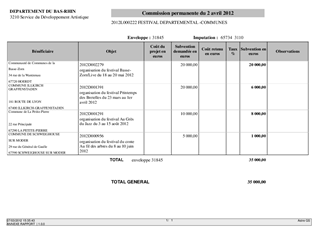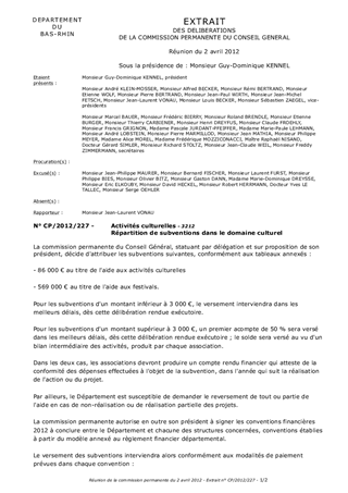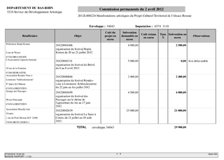 Le présent rapport a pour objet de soumettre à votre approbation les propositions d'intervention du département au titre des activités culturelles, une série de propositions qui s'inscrivent dans le cadre de la charte départementale des festivals ainsi que le versement du montant de la cotisation 2012 à l'association Culture et Départements.