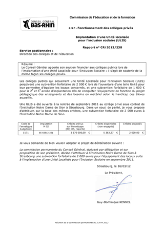 Le Conseil Général apporte son soutien financier aux collèges publics lors de l'implantation d'une Unité Localisée pour l'Inclusion Scolaire ; il s'agit de soutenir de la même façon les collèges privés.