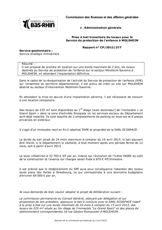 Il est proposé de prendre en location sur une durée maximale de 2 ans, les locaux destinés au Service de protection de l'enfance sur le secteur Molsheim-Saverne à MOLSHEIM, en attendant l'implantation définitive.