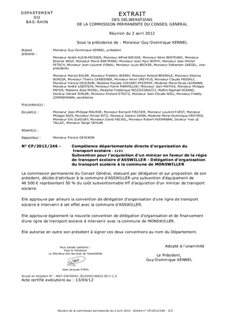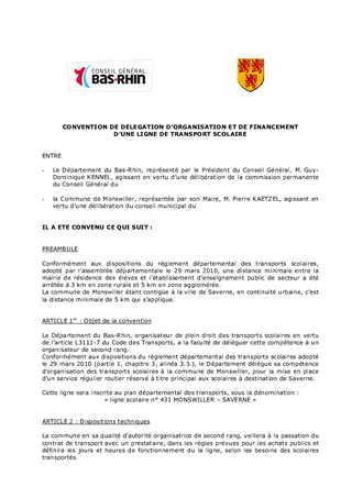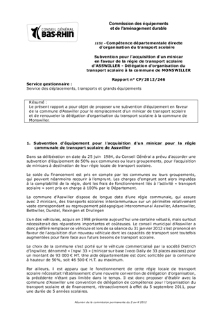 Le présent rapport a pour objet de proposer une subvention d'équipement en faveur de la commune d'Asswiller pour le remplacement d'un minicar de transport scolaire et de renouveler la délégation d'organisation du transport scolaire à la commune de Monswiller.