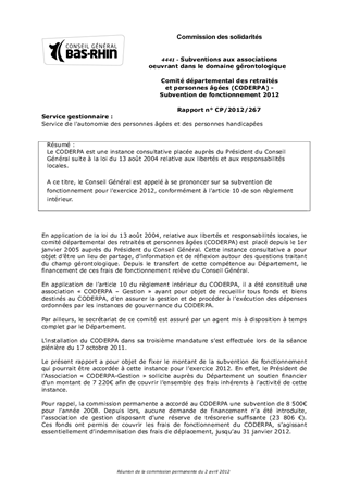 Le CODERPA est une instance consultative placée auprès du Président du Conseil Général suite à la loi du 13 août 2004 relative aux libertés et aux responsabilités locales. A ce titre, le Conseil Général est appelé à se prononcer sur sa subvention de fonctionnement pour l'exercice 2012, conformément à l'article 10 de son règlement intérieur.