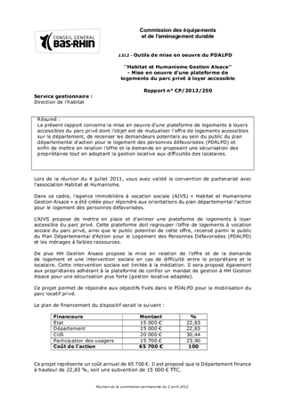 Le présent rapport concerne la mise en oeuvre d'une plateforme de logements à loyers accessibles du parc privé dont l'objet est de mutualiser l'offre de logements accessibles sur le département, de recenser les demandeurs potentiels au sein du public du plan départemental d'action pour le logement des personnes défavorisées (PDALPD) et enfin de mettre en relation l'offre et la demande en proposant une sécurisation des propriétaires tout en adoptant la gestion locative aux difficultés des locataires.