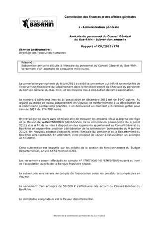Amicale du personnel du Conseil Général du Bas-Rhin - Subvention annuelle