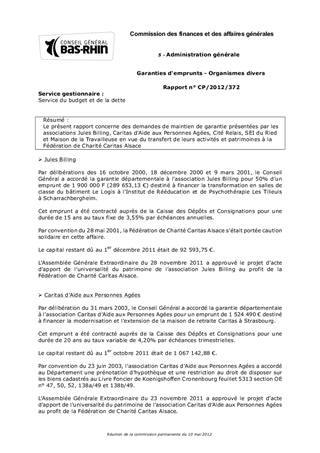 Le présent rapport concerne des demandes de maintien de garantie présentées par les associations Jules Billing, Caritas d'Aide aux Personnes Agées, Cité Relais, SEI du Ried et Maison de la Travailleuse en vue du transfert de leurs activités et patrimoines à la Fédération de Charité Caritas Alsace