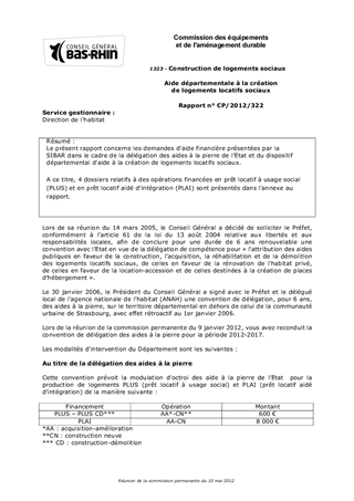 Le présent rapport concerne les demandes d'aide financière présentées par la SIBAR dans le cadre de la délégation des aides à la pierre de l'Etat et du dispositif départemental d'aide à la création de logements locatifs sociaux. A ce titre, 4 dossiers relatifs à des opérations financées en prêt locatif à usage social (PLUS) et en prêt locatif aidé d'intégration (PLAI) sont présentés dans l'annexe au rapport.