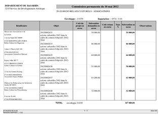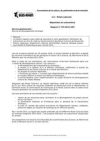 Le présent rapport a pour objet de soumettre à votre approbation l'attribution de subventions au titre de l'aide au fonctionnement des Relais Culturels de Bischwiller, Erstein, Haguenau, Niederbronn, Obernai, Reichshoffen, Saverne, Sélestat, Soultz-sous-Forêts et Wissembourg pour l'année 2012.
