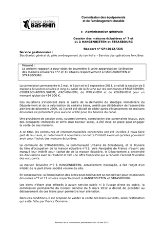 Le présent rappport a pour objet de soumettre à votre appprobation l'aliénation des maisons éclusières n°7 et 11 situées respectivement à HANGENBIETEN et STRASBOURG.
