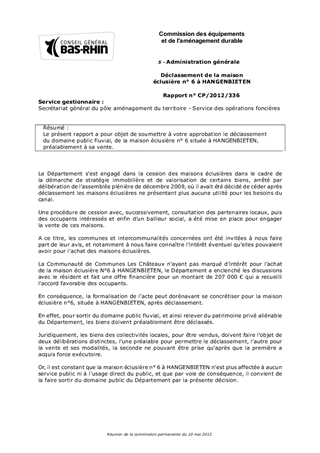 Le présent rapport a pour objet de soumettre à votre approbation le déclassement du domaine public fluvial, de la maison éclusière n° 6 située à HANGENBIETEN, préalablement à sa vente.
