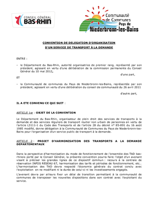 Transport à la demande de la communauté de communes du Pays de Niederbronn-Les-Bains - Convention