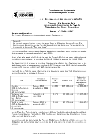 Ce rapport a pour objet de renouveler pour 3 ans la délégation de compétence à la Communauté de communes du Pays de Niederbronn-les-Bains pour l'organisation du transport à la demande ''Taxi pour tous''.