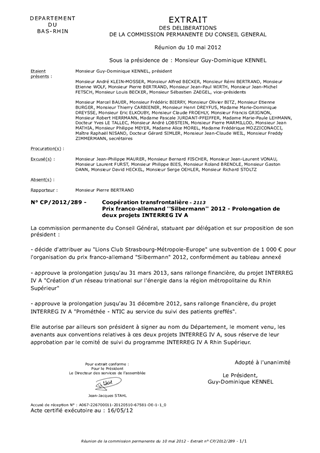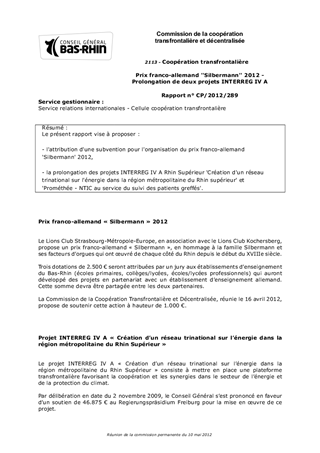 Le présent rapport vise à proposer : - l'attribution d'une subvention pour l'organisation du prix franco-allemand 'Silbermann' 2012, - la prolongation des projets INTERREG IV A Rhin Supérieur 'Création d'un réseau trinational sur l'énergie dans la région métropolitaine du Rhin supérieur' et 'Prométhée - NTIC au service du suivi des patients greffés'.