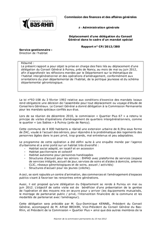 Le présent rapport a pour objet la prise en charge des frais liés au déplacement d'une délégation du Conseil Général à Pulnoy, près de Nancy, au mois de mai ou juin 2012, afin d'approfondir les réflexions menées par le Département sur la thématique de l'habitat intergénérationnel et des opérations d'aménagement, conformément aux orientations du plan départemental de l'habitat, de la politique jeunesse et du schéma départemental gérontologique.