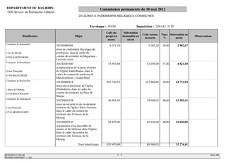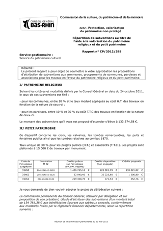 Le présent rapport a pour objet de soumettre à votre approbation les propositions d'attribution de subventions aux communes, groupements de communes, paroisses et associations pour les travaux en faveur du patrimoine religieux et du petit patrimoine.