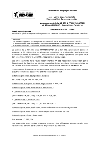 Le présent rapport a pour objet de soumettre à votre approbation les modalités d'indemnisation des acquisitions foncières nécessaires à l'aménagement de la RD 235 sur le territoire des communes de PFAFFENHOFFEN et SCHALKENDORF.