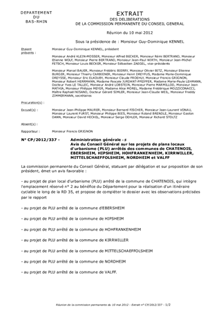Le Département suit l'élaboration de l'ensemble des Plans Locaux d'Urbanisme sur le territoire bas-rhinois, au titre de sa mission de « Personne publique associée » aux documents d'urbanisme. Un certain nombre de communes finalisent actuellement leurs projets et arrivent en phase de PLU « arrêté ». Conformément à l'article L-123-9 du Code de l'Urbanisme, ces documents sont transmis au Département, pour qu'il fasse connaître son avis, en tant que personne publique associée.