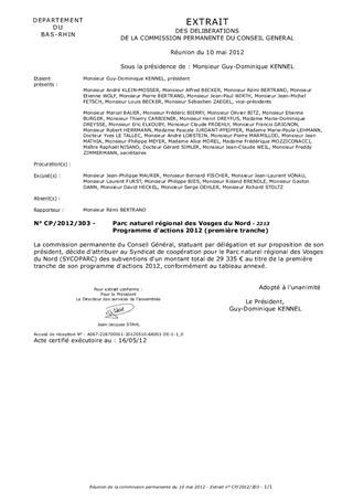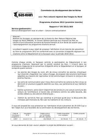 Membre du Sycoparc et signataire de la charte du Parc Naturel Régional des Vosges du Nord (PNRVN), le Conseil Général participe aux missions du Parc au travers d'une subvention annuelle de fonctionnement et d'un fonds de soutien pour l'accompagnement du programme d'actions annuel. Le présent rapport a pour objet de proposer l'attribution d'une tranche de subvention au titre du programme 2012 en conformité avec la convention d'objectifs régissant les relations entre le Département et le Sycoparc pour la période 2010-2012.