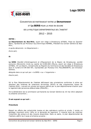 Le présent rapport a pour objet la formalisation du partenariat entre le Département et la Société d'Aménagement et d'Equipement de la Région de Strasbourg (SERS). L'enjeu de cette convention est de mobiliser la SERS dans le cadre des démarches d'extension urbaine ou de renouvellement urbain des communes candidates au dispositif 'Quartier Plus 67', conformément aux orientations du Plan Département de l'Habitat.