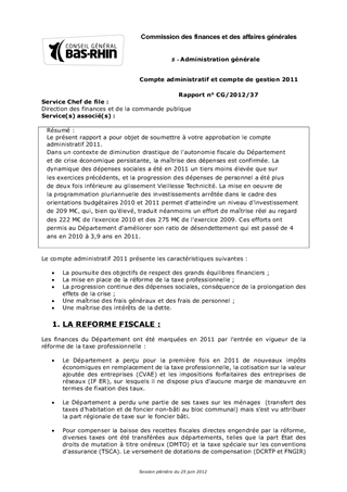 Le présent rapport a pour objet de soumettre à votre approbation le compte administratif 2011. Dans un contexte de diminution drastique de l'autonomie fiscale du Département et de crise économique persistante, la maîtrise des dépenses est confirmée. La dynamique des dépenses sociales a été en 2011 un tiers moins élevée que sur les exercices précédents, et la progression des dépenses de personnel a été plus de deux fois inférieure au glissement Vieillesse Technicité. La mise en oeuvre de la programmation pluriannuelle des investissements arrêtée dans le cadre des orientations budgétaires 2010 et 2011 permet d'atteindre un niveau d'investissement de 209 M€, qui, bien qu'élevé, traduit néanmoins un effort de maîtrise réel au regard des 222 M€ de l'exercice 2010 et des 275 M€ de l'exercice 2009. Ces efforts ont permis au Département d'améliorer son ratio de désendettement qui est passé de 4 ans en 2010 à 3,9 ans en 2011.