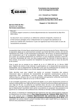 Le présent rapport concerne la charte départementale de l'accessibilité du Bas-Rhin 2012-2014. Ce document vise à constituer un référentiel cohérent d'objectifs, d'actions et d'interventions partagés entre le Département et la plupart des opérateurs du champ de l'habitat afin d'améliorer le parc de logements bas-rhinois dans le sens de l'accessibilité universelle.