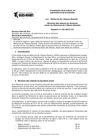Le présent rapport a pour objet de mettre à jour les statuts du Syndicat mixte du Mémorial de l'Alsace-Moselle. Cette révision est destinée, à la fois à assurer un rôle de chef de file à la Région Alsace dans la gouvernance du Mémorial, et à reprendre certaines dispositions contenues dans ses statuts, douze ans après sa création.