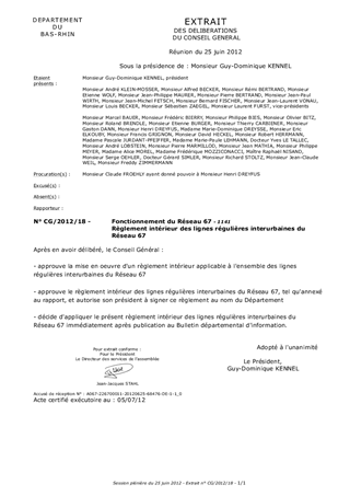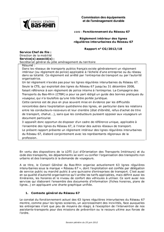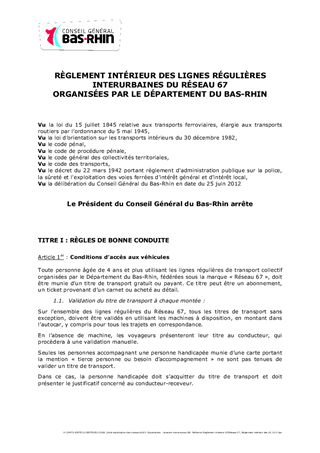 Dans les réseaux de transports publics français existe généralement un règlement intérieur (ou règlement de police) applicable à l'échelle d'une entreprise ou du réseau dans sa totalité. Ce règlement est arrêté par l'entreprise de transport ou par l'autorité organisatrice. Un tel règlement n'existe pas pour les lignes régulières interurbaines du Réseau 67. Seule la CTS, qui exploitait des lignes du Réseau 67 jusqu'au 31 décembre 2008, faisait référence à son règlement de police interne à l'entreprise. La Compagnie des Transports du Bas-Rhin (CTBR) a pour sa part rédigé un guide des bonnes pratiques du voyageur, qui n'a toutefois qu'une très faible portée juridique. Cette carence est de plus en plus souvent mise en évidence par les difficultés rencontrées dans l'exploitation quotidienne des lignes, en particulier dans les relations entre les conducteurs-receveurs et leur clientèle (état d'ébriété, refus d'achat de titre de transport, chahut...), sans que les conducteurs puissent opposer aux voyageurs un document particulier. Il apparaît donc opportun de disposer d'un cadre de référence unique, applicable à l'ensemble des lignes du Réseau 67, à l'instar des autres réseaux de transport. Le présent rapport présente un règlement intérieur des lignes régulières interurbaines du Réseau 67, élaboré conjointement avec les représentants régionaux de la profession.
