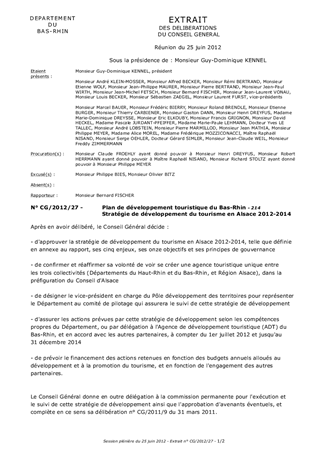L'Alsace est une région à forte identité dont la notoriété comme destination touristique est reconnue. Les acteurs publics du tourisme ont su développer au fil des ans une collaboration étroite : harmonisation des dispositifs d'aides avec guichet unique, outils de promotion communs, site Internet unique pour la destination Alsace. Ce contexte a favorisé une réflexion partenariale en vue de l'élaboration d'une stratégie touristique unique pour l'Alsace, mieux coordonnée, plus efficace et adaptée aux attentes nouvelles de la clientèle touristique. Elle porte sur la période 2012-2014 dans l'attente des évolutions institutionnelles à venir. Le Conseil Général du Bas-Rhin, en appui sur l'Agence de Développement Touristique (ADT) du Bas-Rhin, a joué un rôle moteur en adoptant lors de sa session plénière des 12 et 13 décembre 2011 sa contribution à la réflexion commune. Elle participe très largement au tronc commun de la stratégie touristique unique pour l'Alsace qui sera soumise à la validation des assemblées délibérantes des trois collectivités lors de leur réunion respective de juin 2012. Il vous est proposé d'adopter la définition d'une nouvelle stratégie touristique pour l'Alsace fixant les enjeux et les priorités communes aux collectivités régionale et départementales pour la période 2012 à 2014.