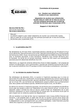 Le présent rapport a pour objet l'adaptation du soutien aux collectivités locales, dans le cadre de la mise oeuvre de leur politique jeunesse par le biais de Contrats territoriaux pour la jeunesse (CTJ).