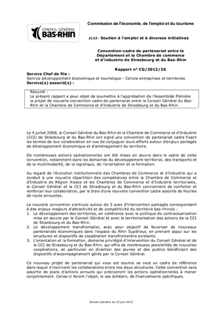 Le présent rapport a pour objet de soumettre à l'approbation de l'Assemblée Plénière le projet de nouvelle convention cadre de partenariat entre le Conseil Général du Bas-Rhin et la Chambre de Commerce et d'Industrie de Strasbourg et du Bas-Rhin.