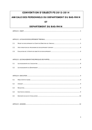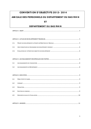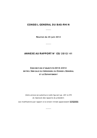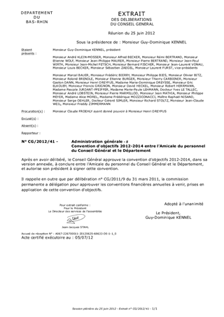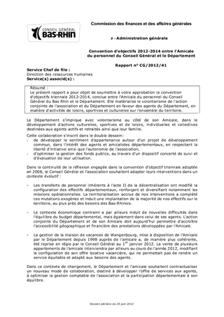 Le présent rapport a pour objet de soumettre à votre approbation la convention d'objectifs triennale 2012-2014, conclue entre l'Amicale du personnel du Conseil Général du Bas Rhin et le Département. Elle matérialise le volontarisme de l'action conjointe de l'association et du Département en faveur des agents du Département, en matière d'activités de loisirs, sportives et culturelles sur l'ensemble du territoire.