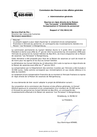 Le présent rapport a pour objet d'autoriser le versement d'une compensation financière à l'Amicale du personnel, en contrepartie des investissements réalisés à la Maison ''Les Terrasses'' à Wangenbourg.