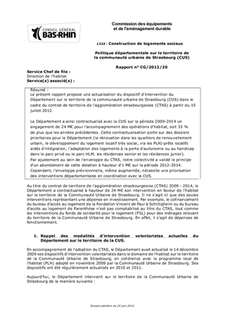 Le présent rapport propose une actualisation du dispositif d'intervention du Département sur le territoire de la communauté urbaine de Strasbourg (CUS) dans le cadre du contrat de territoire de l'agglomération strasbourgeoise (CTAS) à partir du 15 juillet 2012. Le Département a ainsi contractualisé avec la CUS sur la période 2009-2014 un engagement de 24 M€ pour l'accompagnement des opérations d'habitat, soit 33 % de plus que les années précédentes. Cette contractualisation porte sur des dossiers prioritaires pour le Département (la rénovation dans les quartiers de renouvellement urbain, le développement du logement locatif très social, via les PLAI-prêts locatifs aidés d'intégration, l'adaptation des logements à la perte d'autonomie ou au handicap dans le parc privé ou le parc HLM, les résidences senior et les résidences junior). Par ajustement au sein de l'enveloppe du CTAS, notre collectivité a validé le principe d'un abondement de cette dotation à hauteur d'1 M€ sur la période 2012-2014. Cependant, l'enveloppe prévisionnelle, même augmentée, nécessite une priorisation des interventions départementales en coordination avec la CUS.