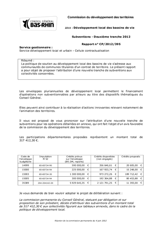 La politique de soutien au développement local des bassins de vie s'adresse aux communautés de communes titulaires d'un contrat de territoire. Le présent rapport a pour objet de proposer l'attribution d'une nouvelle tranche de subventions aux collectivités concernées.