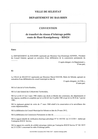 Convention de transfert à la ville de SELESTAT du réseau d'éclairage public de la route du Haut-Koenigsbourg (RD 424)