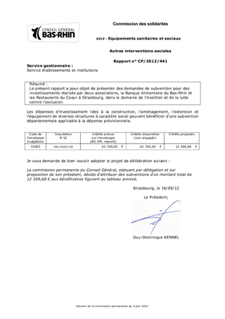 Le présent rapport a pour objet de présenter des demandes de subvention pour des investissements réalisés par deux associations, la Banque Alimentaire du Bas-Rhin et les Restaurants du Coeur à Strasbourg, dans le domaine de l'insertion et de la lutte contre l'exclusion.