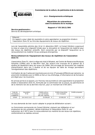 Ce rapport a pour objet de soumettre à votre approbation la proposition d'aide à l'association Zone 51 au titre des équipements de locaux de répétition.