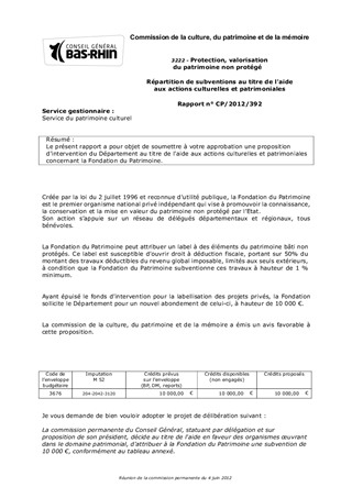 Le présent rapport a pour objet de soumettre à votre approbation une proposition d'intervention du Département au titre de l'aide aux actions culturelles et patrimoniales concernant la Fondation du Patrimoine.