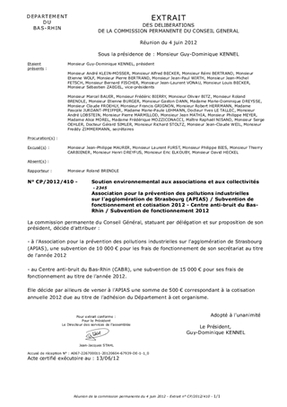 L'Association pour la Prévention des Pollutions Industrielles sur l'Agglomération de Strasbourg (APIAS), créée en 2002 et basée à la DREAL, sert de support aux actions du Secrétariat Permanent pour la Prévention des Pollutions Industrielles sur l'Agglomération de Strasbourg (SPPPI). Le Conseil Général participe aux frais de secrétariat et cotise également annuellement en qualité de membre actif à cette association. Il a été annoncé au Centre Anti-Bruit du Bas-Rhin à l'automne 2009, un financement du Conseil Général dégressif à compter de 2010, financement dégressif qui se monterait à 15 000 € en 2012.