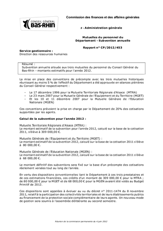 Subvention annuelle allouée aux trois mutuelles du personnel du Conseil Général du Bas-Rhin - montants estimatifs pour l'année 2012.
