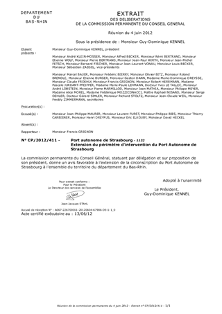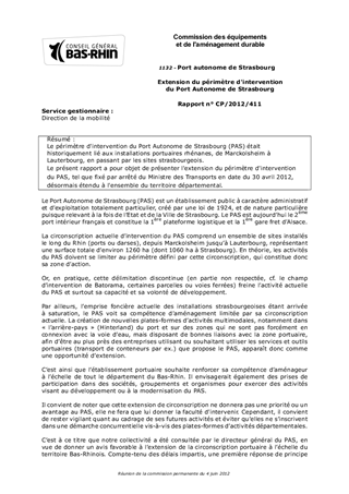 Le périmètre d'intervention du Port Autonome de Strasbourg (PAS) était historiquement lié aux installations portuaires rhénanes, de Marckolsheim à Lauterbourg, en passant par les sites strasbourgeois. Le présent rapport a pour objet de présenter l'extension du périmètre d'intervention du PAS, tel que fixé par arrêté du Ministre des Transports en date du 30 avril 2012, désormais étendu à l'ensemble du territoire départemental.