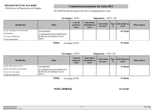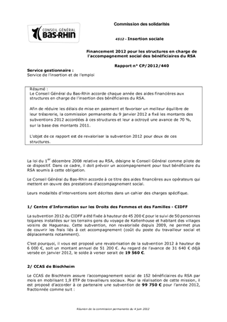 Le Conseil Général du Bas-Rhin accorde chaque année des aides financières aux structures en charge de l'insertion des bénéficiaires du RSA. Afin de réduire les délais de mise en paiement et favoriser un meilleur équilibre de leur trésorerie, la commission permanente du 9 janvier 2012 a fixé les montants des subventions 2012 accordées à ces structures et leur a octroyé une avance de 70 %, sur la base des montants 2011. L'objet de ce rapport est de revaloriser la subvention 2012 pour deux de ces structures.